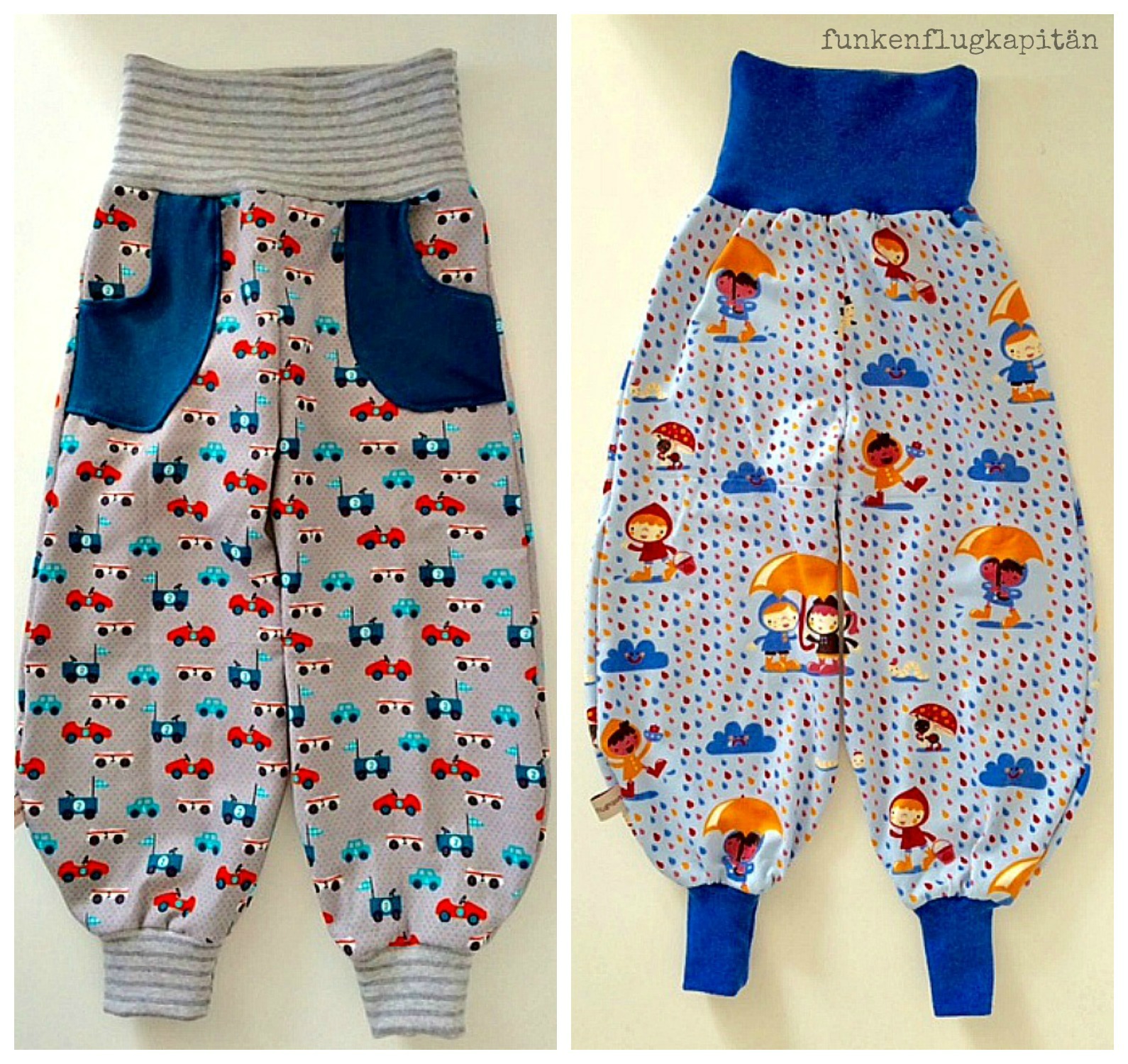 Die Hose mit dem Roboterstoff ist aus Jersey und hat vorne zwei Aufsatztaschen. Die Pumphose aus dem Autostoff ist aus Feincord und hat auch vorne zwei Aufsatztaschen. Die Hose mit Regentropfenstoff ist auch aus Jersey. Im Schnittmuster sind verschiedene Varianten für die Pumphose enthalten. Auch eine Knickerbockerversion. Und verschiedene Taschen und Kniepatches. Eigentlich für ist das Schnittmuster für dehnbaren Stoff gedacht. Ich habe also die Cordhose einfach eine Nummer größer zugeschnitten.