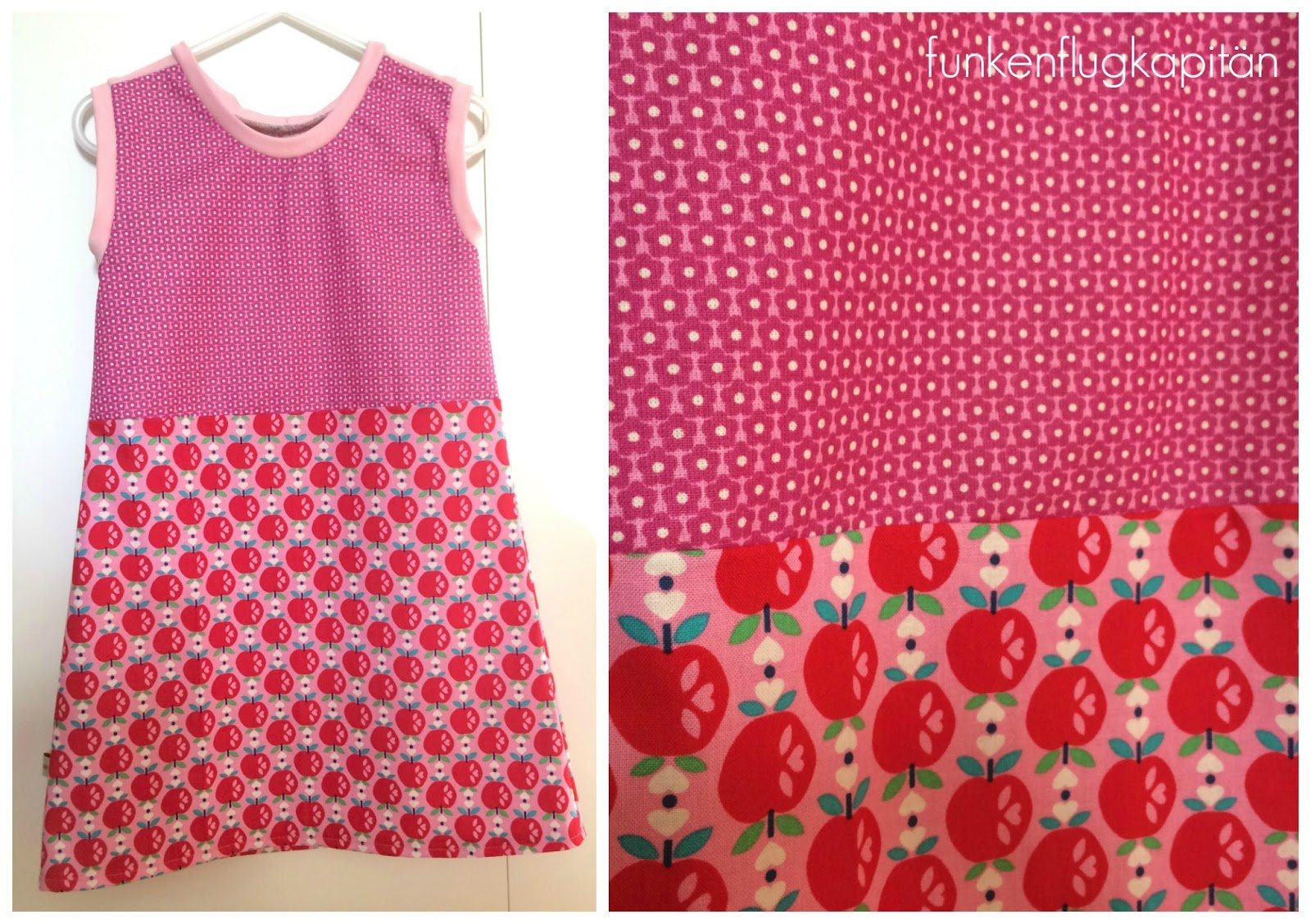 Die Kleidchen sind nach dem Ebook Quickly von Nemada entstanden. Das Ebook bekommst du als Freebook auf dem Blog von Nemada. Ich habe für das lilane Kleid Feincordstoff und für das rote mit Äpfeln Webware vernäht. Zusätzlich zum Stoff brauchst du noch etwas Bündchenware für den Halsausschnitt und die Ärmel. Weil ich etwas unsicher war ob man das Kleid aus dem Baumwollstoff über den Kopf bekommt (er ist ja nicht dehnbar) habe ich oben an den Schultern noch ein kleines Stück aus Bündchenware eingesetzt. Da das Kleid nur aus wenigen Schnittteilen besteht, ist es wirklich schnell genäht.