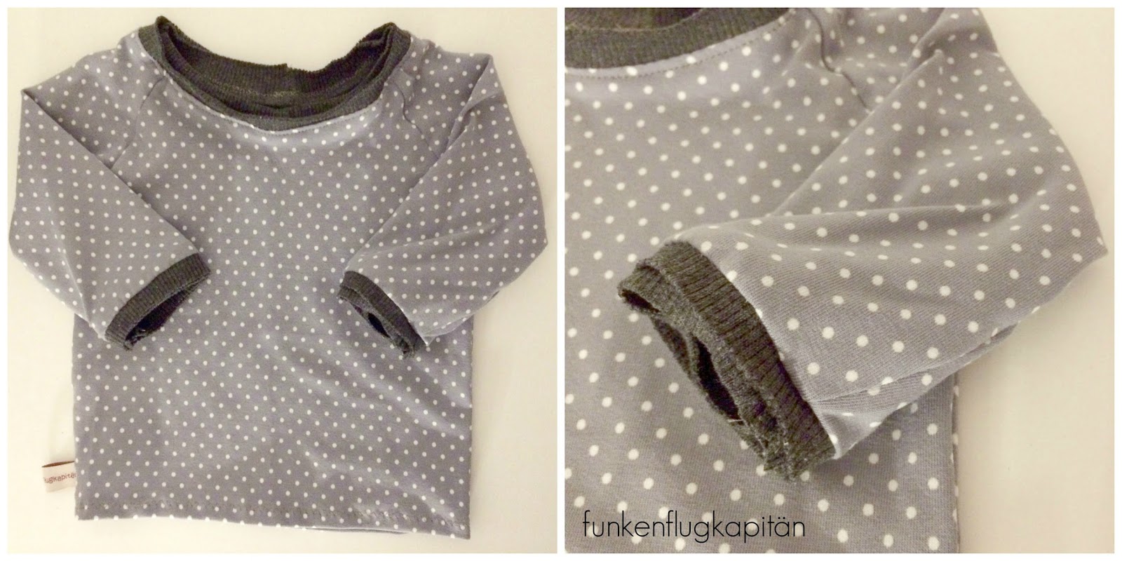 Dann ist noch dieser klitzekleine Longsleeve für ein Neugeborenes entstanden. Ich habe ihn auch gerade noch rechtzeitig verschenkt, denn das Baby kam dann 3 Wochen zu früh. Aber es hat alles gepasst und die Mama hat sich sehr gefreut. Die Bündchen am Hals und an den Ärmeln habe ich mit einem offenen Saum gemacht und das Shirt ist aus Jerseystoff genäht.
