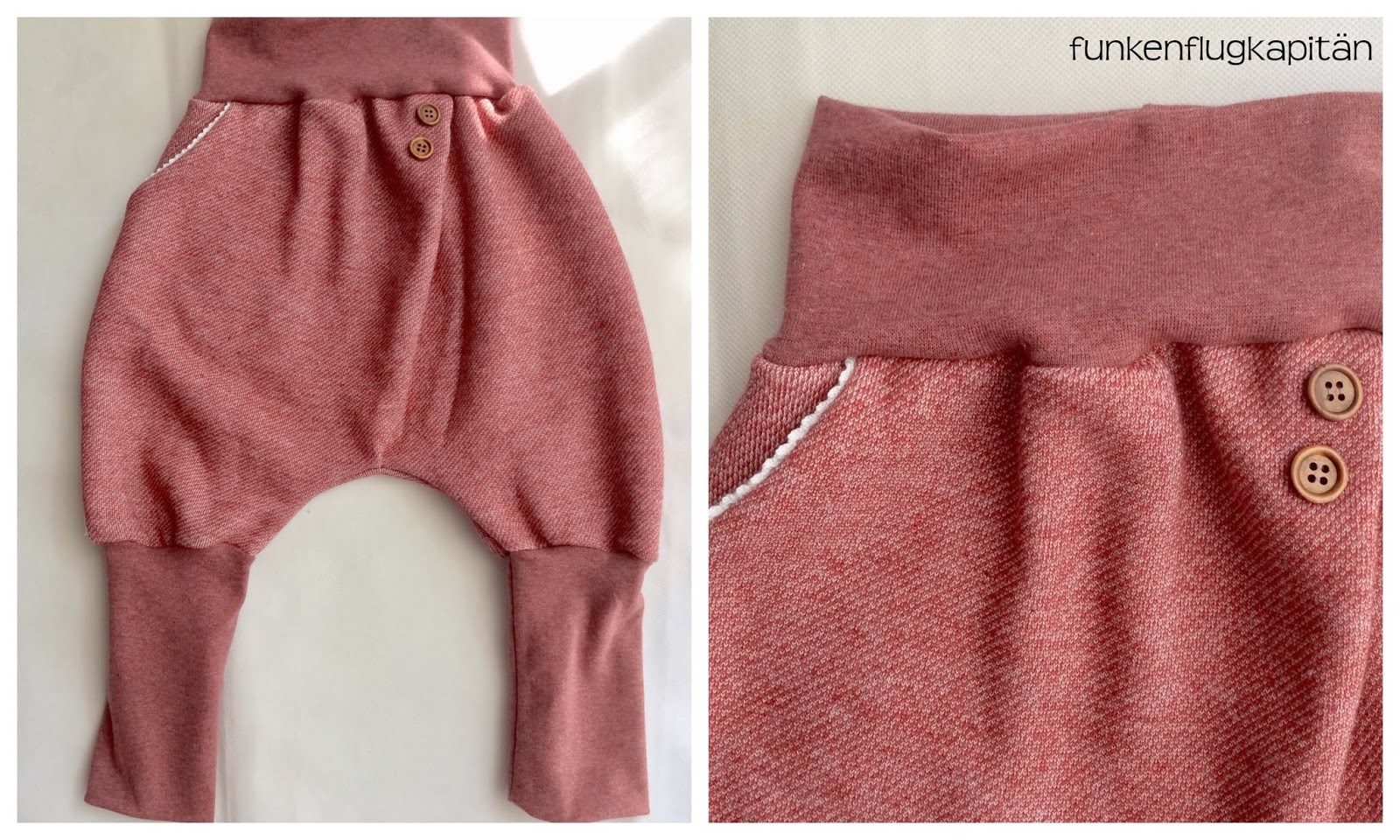 Und dann gabe es noch eine kleine Pumphose mit Knopfleiste und kleiner Tasche. Die hose habe ich aus French Terry genäht und die kleine Tasche mit Spitze verziert.
