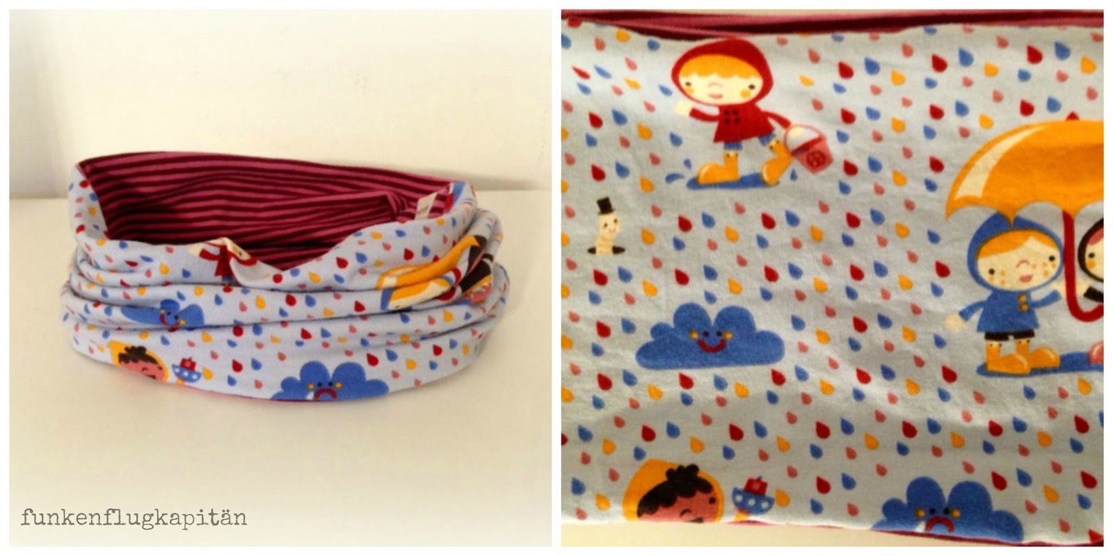 Da die Loops aus Jerseystoff ein wirklich schnelles und einfaches Nähprojekt sind, habe ich davon schon sehr viele genäht. Ein paar der Schals kannst du dir hier oder hier anschauen. Bei dem roten Loop habe ich für den Innenstoff ein kuschliges Fleece genommen. Da ist der Loop gleich auch noch Wintertauglich. Du kannst den Loop natürlich auch aus anderen dehnbaren Stoffen nähen und mußt nicht Jersey nehmen. Ich habe auch schon Loops aus Webware genäht, die waren dann aber länger und zum zweimal umschlagen.
