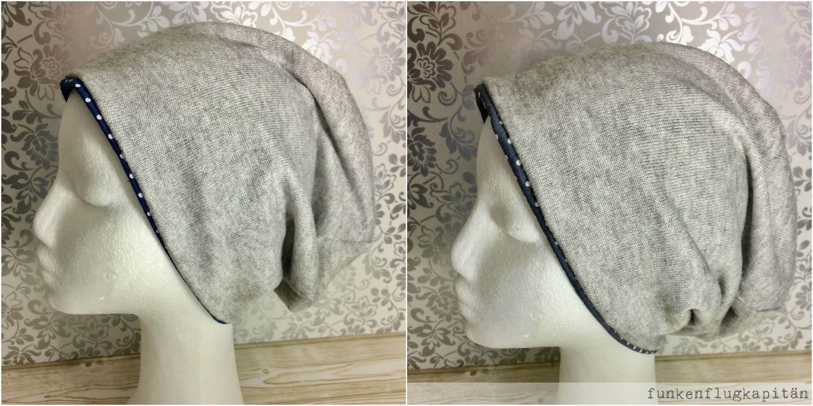 Die hellgrauen Beanies sind aus sehr feinem Strickstoff und die Innenseite ist aus Jersey.