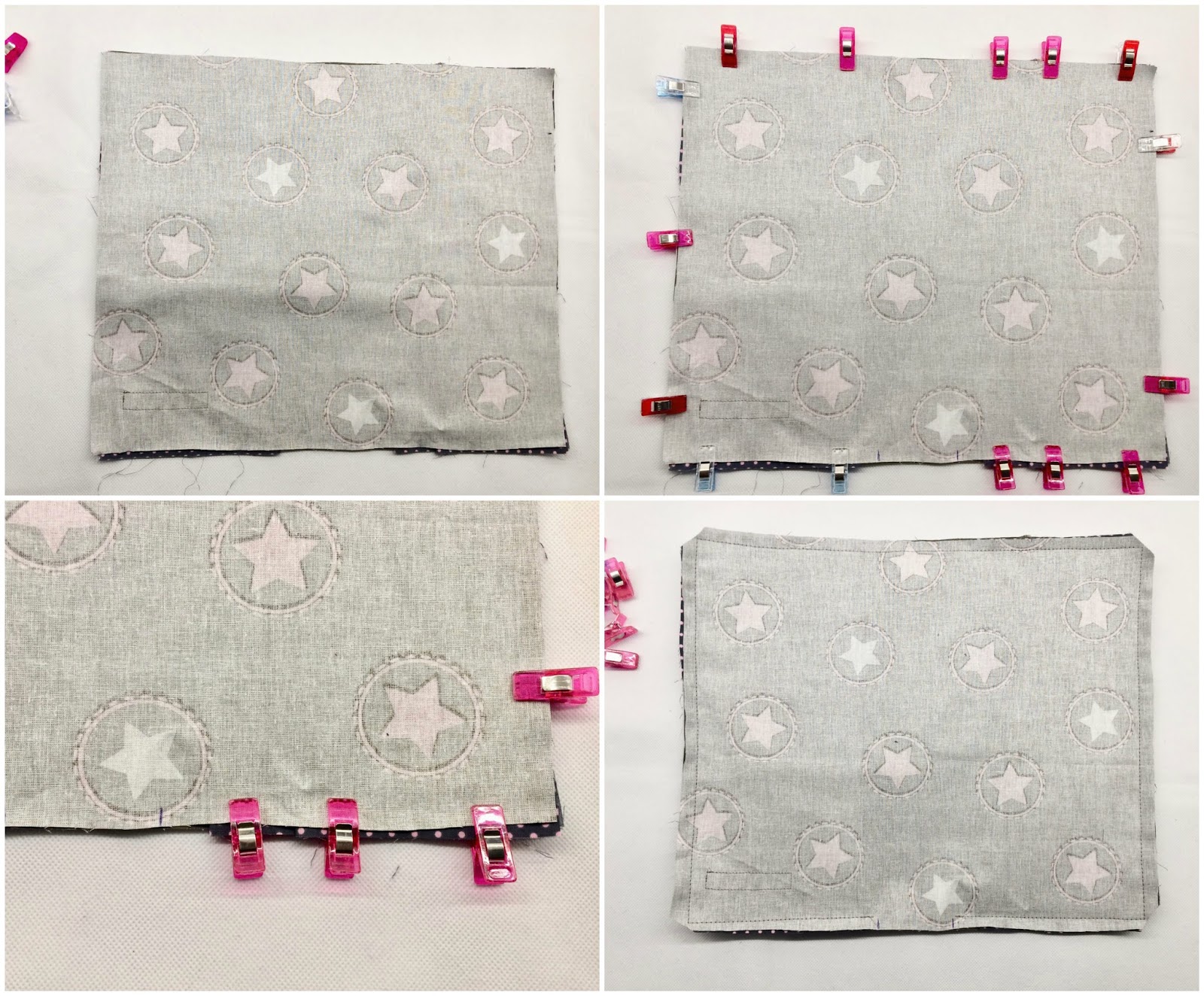Den Außenstoff mit der linken Seite nach oben auf alles auflegen. Alles zusammen klammern oder heften. An der unteren breiten Seite in der Mitte die Wendeöffnung markieren. So kannst du sie nicht vergessen 😉