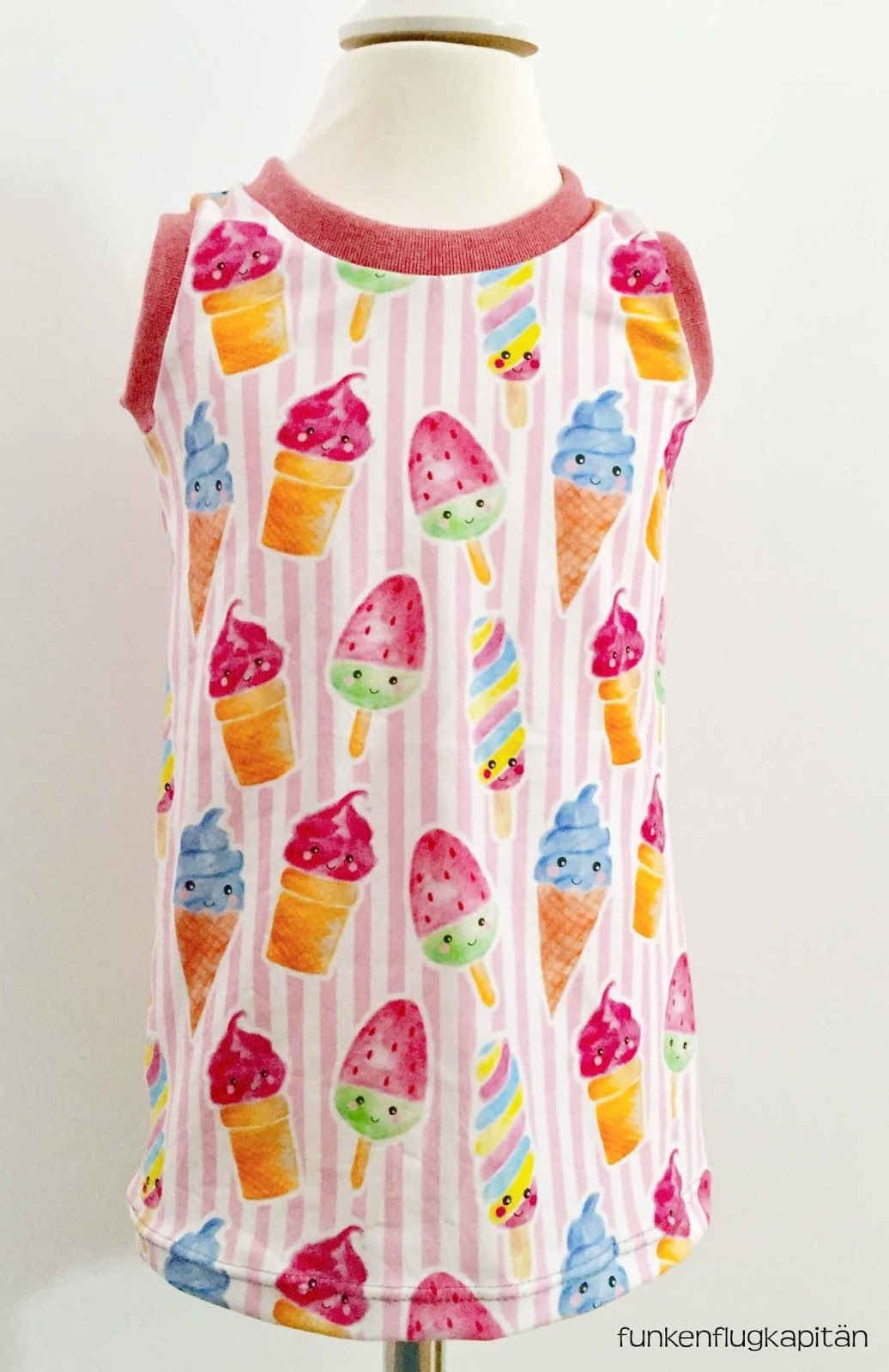 Für Kids habe ich auch ein paar Sommersachen genäht. Es gab noch ein paar Strandkleidchen für die Kids. Einmal aus Jersey ohne Ärmel mit Eisaufdruck und einmal aus Frottee mit Kapuze und Bommeln an der Tasche vorn.