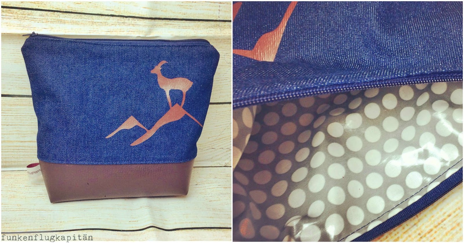 Die kleine Tasche war ein Weihnachtsgeschenk für den Freund meiner Schwester. Außen Kunstleder und Jeans und innen mit Wachstuch. Ich habe das Täschchen noch mit einer Plotdatei von Chrissibag mit Bergen und einer Gams bedruckt.