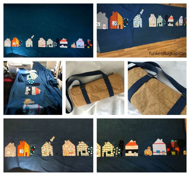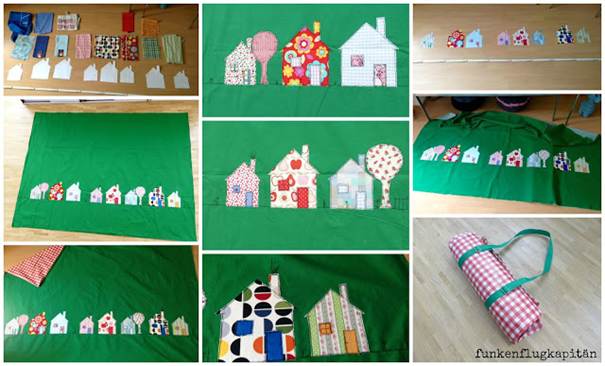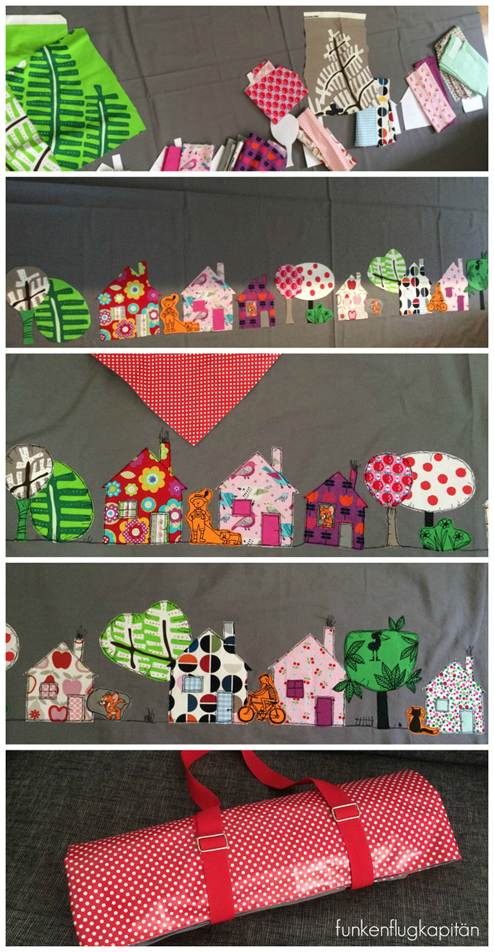 Die Applikationen werden aus Baumwollstoffen mit Freihandnähen auf die Oberseite der Decke aufgebracht. Die Applikation kann individuell ausgesucht werden. Kleine wie der VW Bulli oder große wie die Häuschen ganz unten.