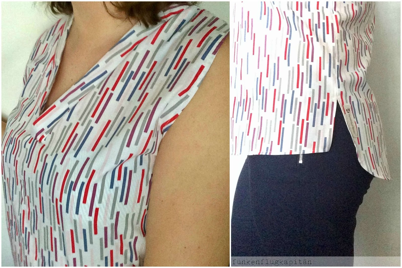 An der Passform des Schnitts habe ich nur wie immer an der Länge etwas zugeben, sonst hat alles gut gepasst. Der Ausschnitt ist gut zu nähen und ich habe verschiedene Stoffarten für die Tops gewählt. Das schwarzweiße Top ist aus Chiffonstoff, das weiße mit bunten Streifen aus normaler Webware und das lilaweinrote aus Leinen. Ich kann es mir auch gut aus Viskose vorstellen, daß probiere ich dann ein anderes Mal.