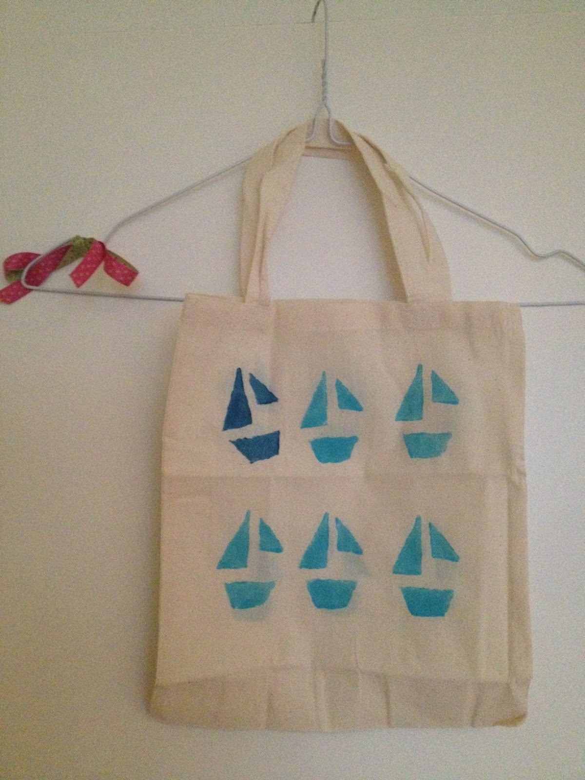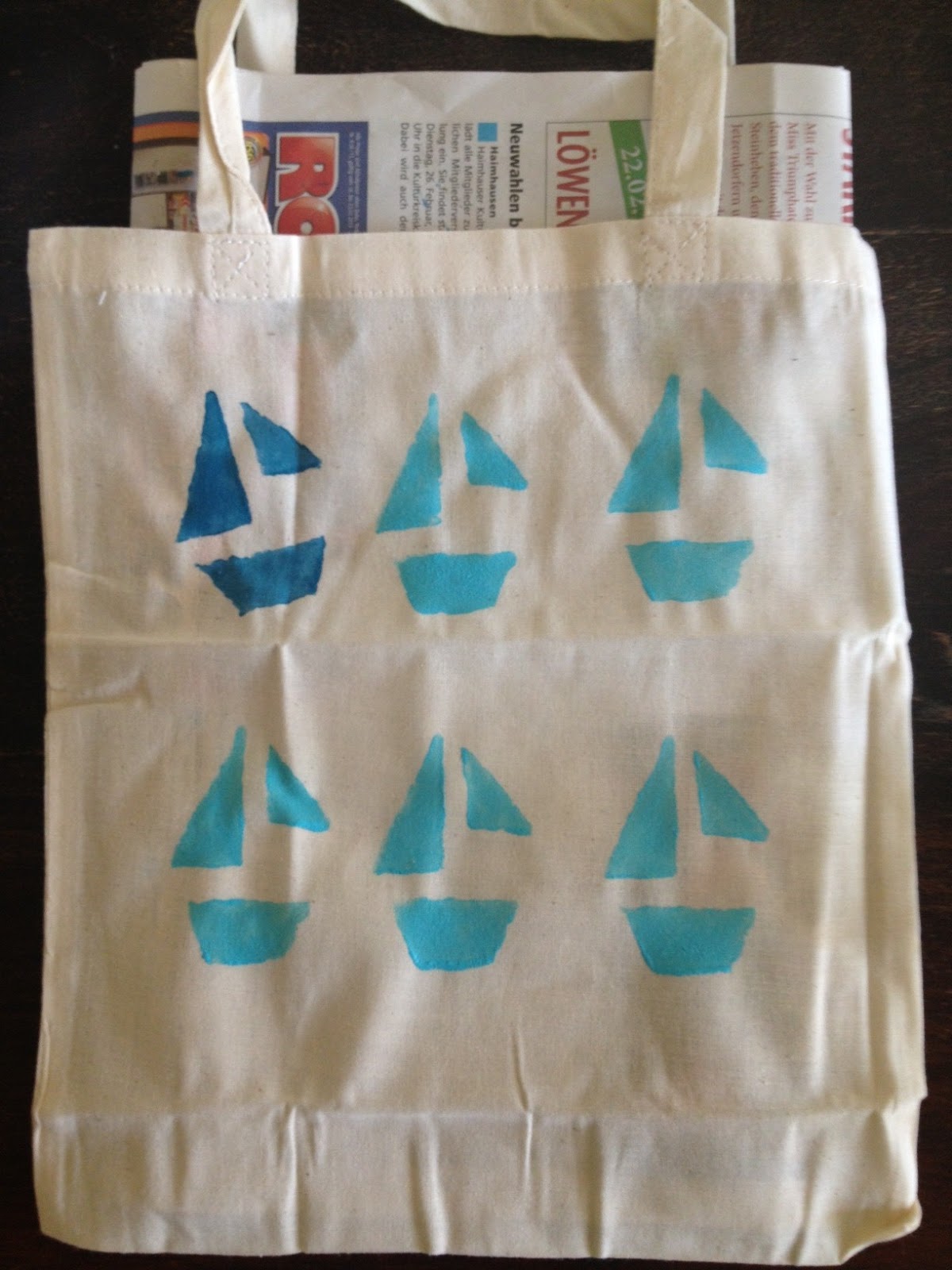 So sieht mein fertiger Stempel dann aus. Ich habe dann die erhöhten Teile mit Farbe bestrichen und den Stempel auf meine Tasche gepresst. Dann ist die Tasche auch schon fertig bedruckt und muß nur noch trocknen. Die Baumwolltaschen habe ich schon fertig so gekauft und einmal ausgewaschen. Sie gibt es in verschiedenen Farben und Größen zu kaufen, kann aber natürlich von dir auch einfach selber genäht werden.