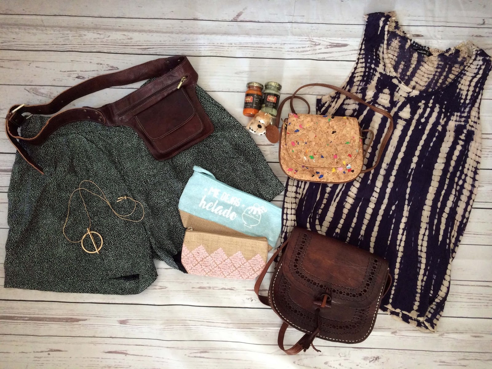 Ledertaschen, Korktasche, kurze Hose, Batiktop, Kosmetiktäschchen, Halskette, etwas Mojo und den kleinen Löwen als Andenken an den Loro Park.